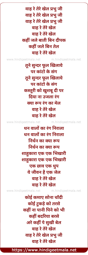 Lyrics of Vaah Re Tere Khel Prabhu Ji - वाह रे तेरे खेल प्रभु जी