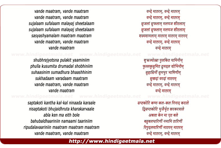Lyrics of Vande Mataram (Reverance) - वन्दे मातरम्, वन्दे मातरम्