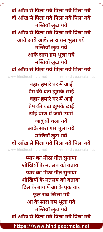 Lyrics of Vo Aankh Se Pilaa Gaye - वो आँख से पिला गये पिला गये पिला गये