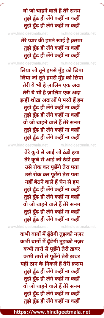Lyrics of Vo Jo Chaahane Vaale Hain Tere Sanam - वो जो चाहने वाले हैं तेरे सनम