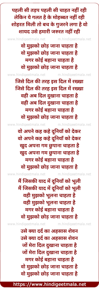 Lyrics of Vo Mujhko Chod Jana Chahta Hai - पहली सी तड़प पहली सी चाहत नहीं रही