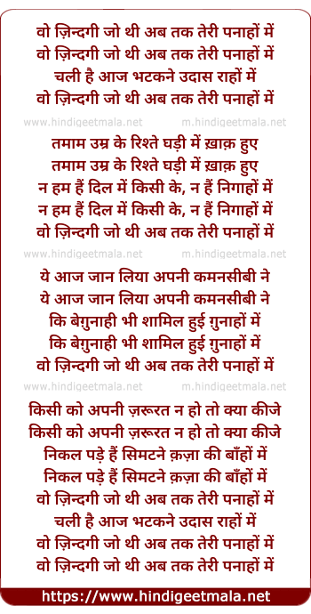 Lyrics of Vo Zindagi Jo Thi Ab Teri Panaahon Men - वो ज़िन्दगी जो थी अब तक तेरी पनाहों में