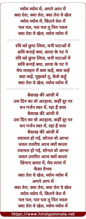 Lyrics of Vyom Vyom Me - व्योम व्योम में, अपने आप में