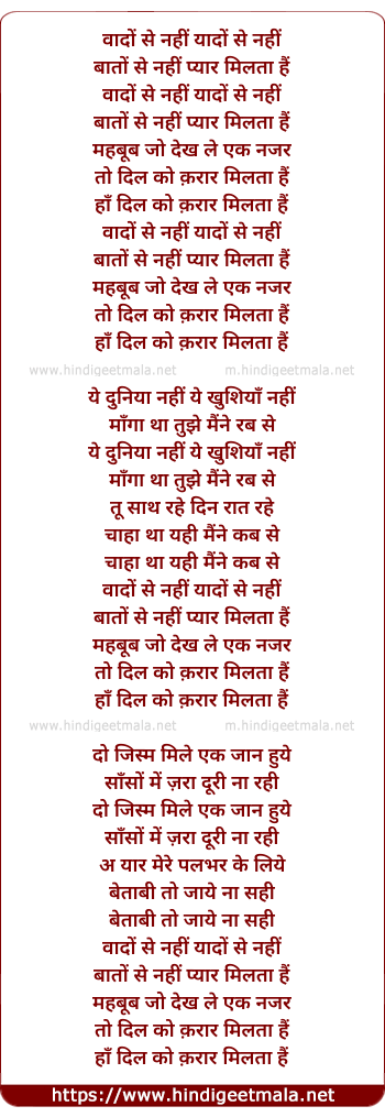 Lyrics of Wadon Se Nahi Hai - वादों से नहीं यादों से नहीं