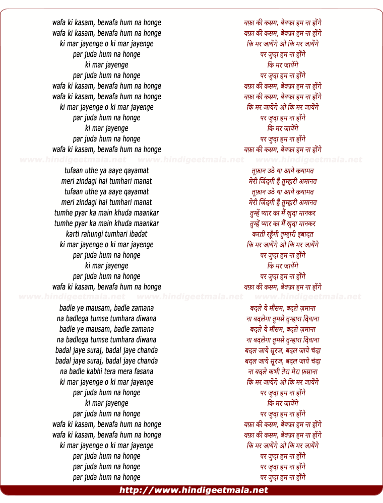 Lyrics of Wafa Ki Kasam (I) - वफ़ा की कसम, बेवफ़ा हम ना होंगे
