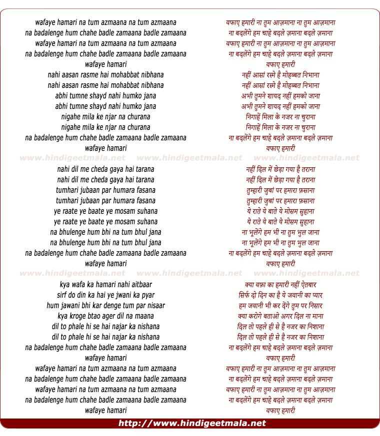 Lyrics of Wafaye Hamari Na Tum Aazmana - वफाए हमारी ना तुम आज़माना ना तुम आज़माना