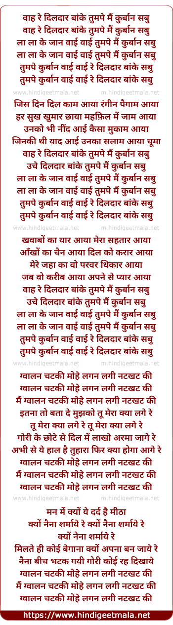 Lyrics of Wah Re Dildaar Banke Tumpe Mai Kurbaan - वाह रे दिलदार बांके तुमपे मैं कुर्बान