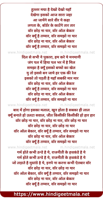 Lyrics of War Chhod Na Yaar (Title Song) - हुल्लर मचा है देखो देखो यहाँ