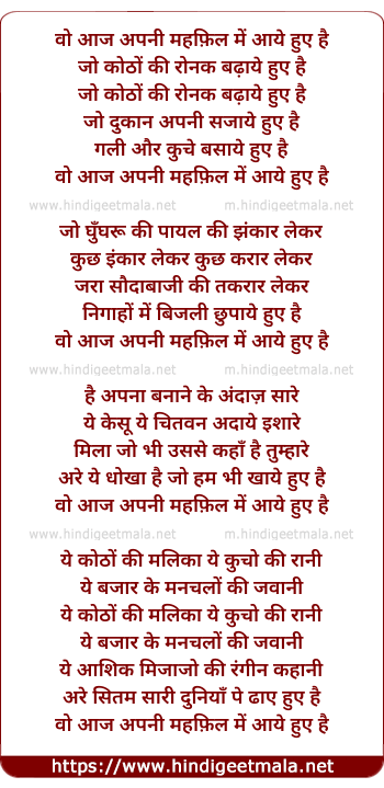 Lyrics of Wo Aaj Apni Mehfil Me Aaye Huye Hai - वो आज अपनी महफ़िल में आये हुए है