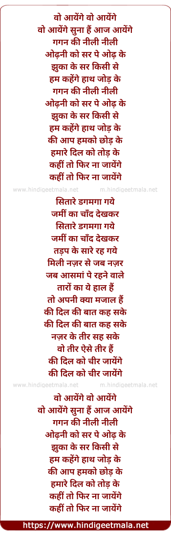Lyrics of Wo Aayenge Gagan Ki Neeli - वो आयेंगे गगन की नीली