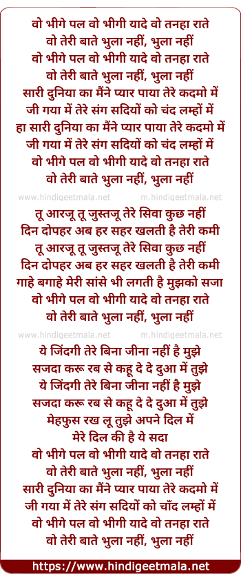 Lyrics of Wo Bhige Pal Wo Bhigi Yaade - वो भीगे पल वो भीगी यादे