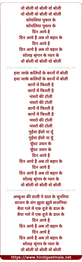 Lyrics of Wo Boli Koyaliya Pukar Ke - वो बोली वो बोली वो बोली