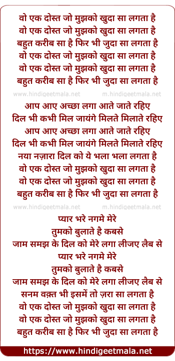 Lyrics of Wo Ek Dost Jo Mujhko Khuda Sa Lagta Hai - वो एक दोस्त जो मुझको खुदा सा लगता है
