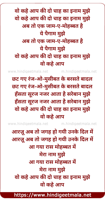 Lyrics of Wo Kahe Aap Ki Do Chah Ka Inaam - वो कहे आप की दो चाह का इनाम मुझे