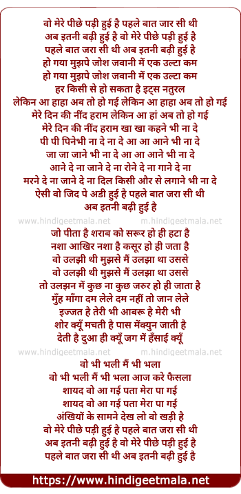 Lyrics of Wo Mere Pichhe Padi Huyi Hai Pahale Baat Jara Si Thi - वो मेरे पीछे पड़ी हुई है पहले बात जार सी थी