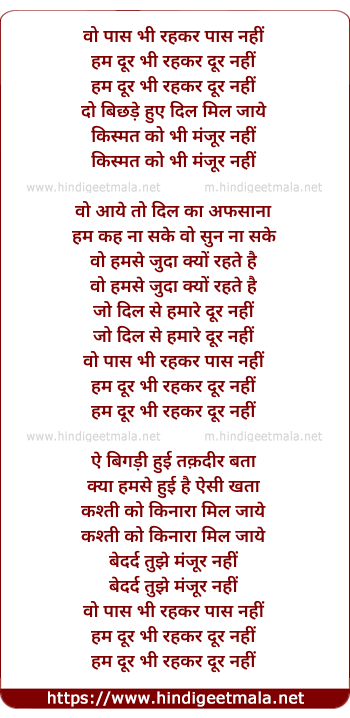 Lyrics of Wo Pas Bhi Rahkar Paas Nahi - वो पास भी रहकर पास नहीं