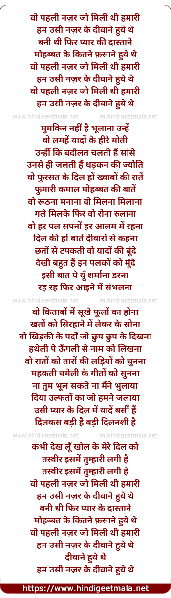 Lyrics of Wo Pehli Nazar - वो पहली नज़र जो मिली थी हमारी