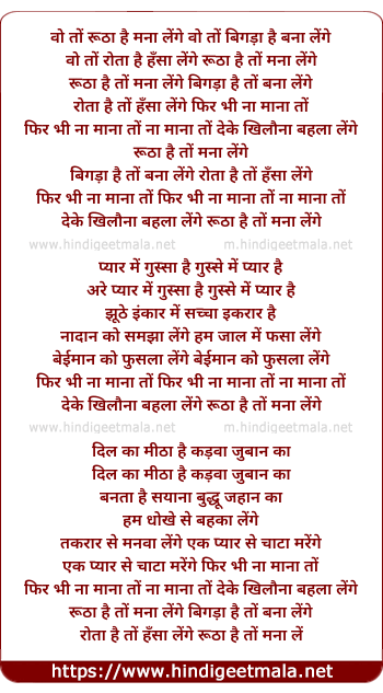 Lyrics of Wo To Rutha Hai Mana Lenge - वो तों रूठा है मना लेंगे