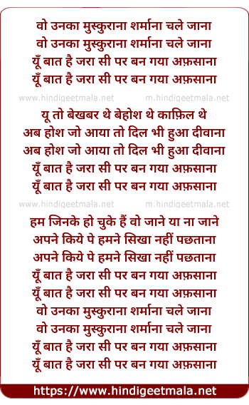 Lyrics of Wo Unka Muskurana Sharmana Chale Jana - वो उनका मुस्कुराना शर्माना चले जाना