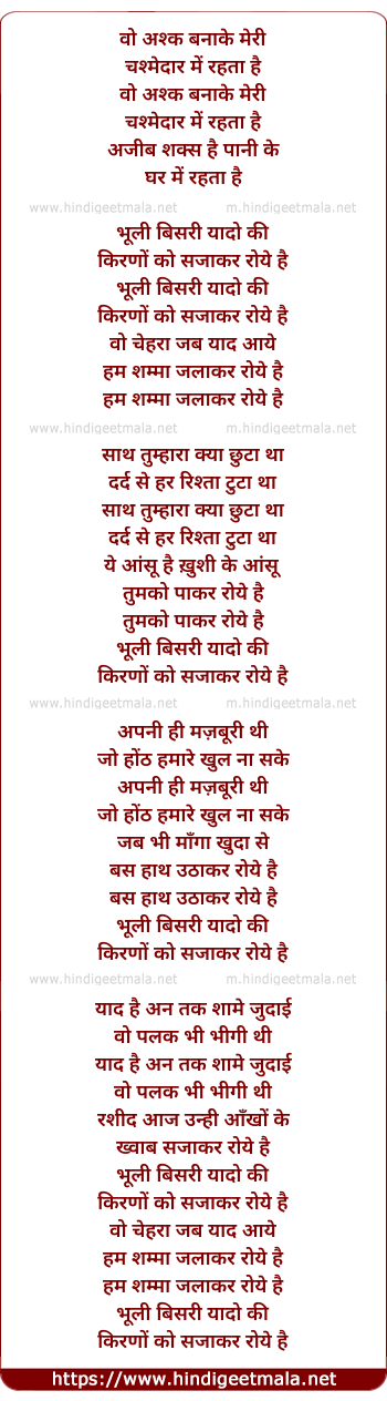 Lyrics of Woh Ashk Banake Meree Chashmedar Me - वो अश्क मेरी चश्मेदार में