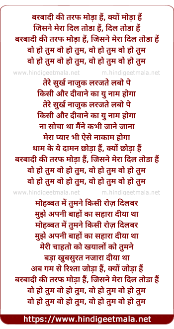 Lyrics of Woh Ho Tum (Sad) - बरबादी की तरफ मोड़ा हैं, क्यों मोड़ा हैं