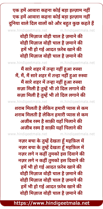 Wohi Mizaaj Wohi Chaal Hai Zamaane Ki - एक हमें आवारा कहना कोई बड़ा इल्ज़ाम नहीं