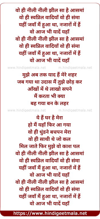 Lyrics of Wohi Neeli Neeli Jheel Saa Hai Aasman - वो ही नीली नीली झील सा है आसमां