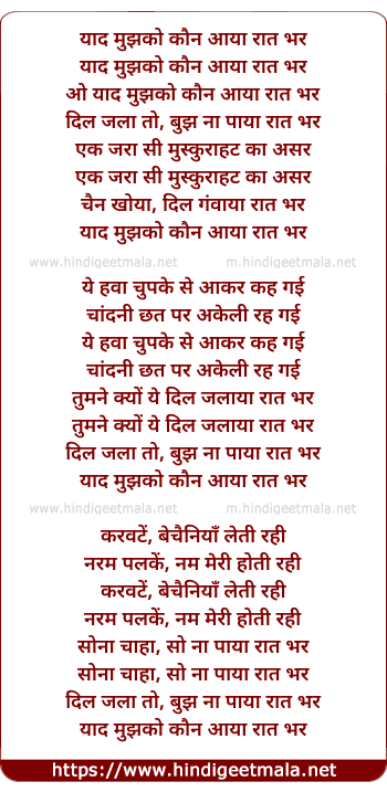 Lyrics of Yaad Mujhko Kaun Aaya - याद मुझको कौन आया रात भर