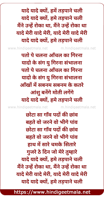 Lyrics of Yade Yade Kyu, Hame Tadpane Chali - यादे यादे क्यों, हमें तड़पाने चली