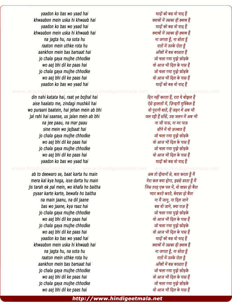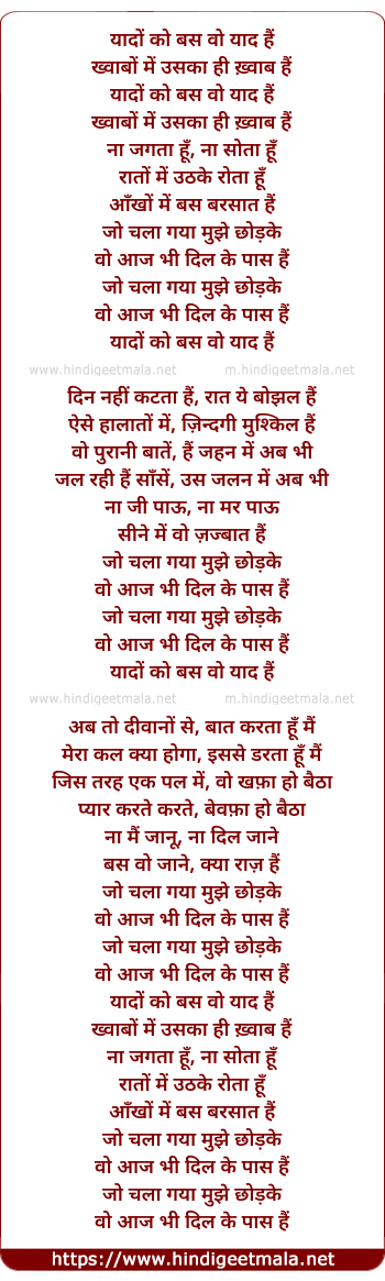 Lyrics of Yaadon Ko Bas Woh Yaad Hai - यादों को बस वो याद हैं