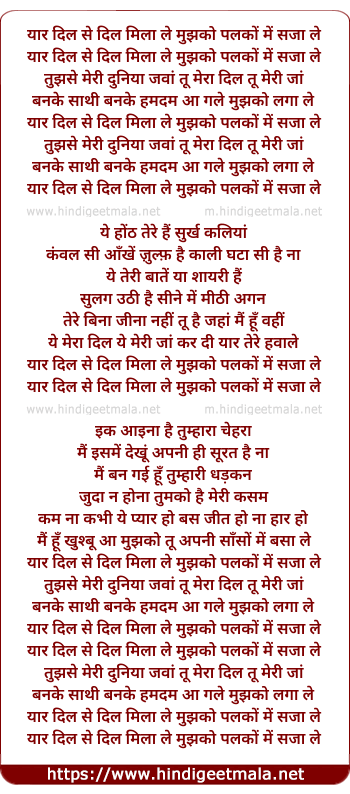 yaar dil se dil mila le mujhko palko me saja le