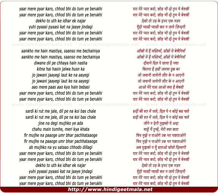 yaar mere pyar karo, chhod bhi do tum ye berukhi