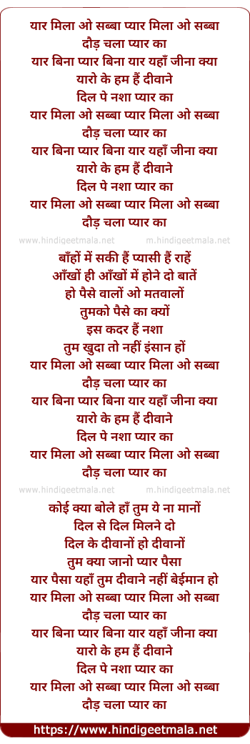 Lyrics of Yaar Mila Pyaar Mila, Daur Chala Pyar Ka - यार मिला प्यार मिला, दौर चला प्यार का