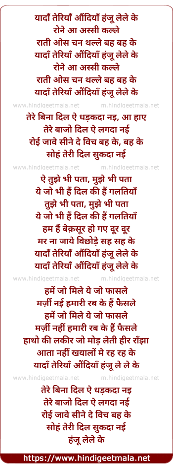 Lyrics of Yadan Teriyan - यादाँ तेरियाँ