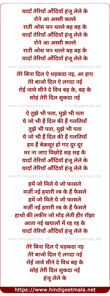 Lyrics of Yadaan Teriyaan (Rahat Fateh Ali Khan) - यादाँ तेरियाँ औंदियाँ हंजू लेले के