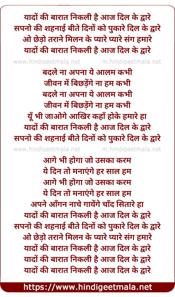 Lyrics of Yado Kee Barat Niklee Hai Aaj - यादों की बारात निकली है आज