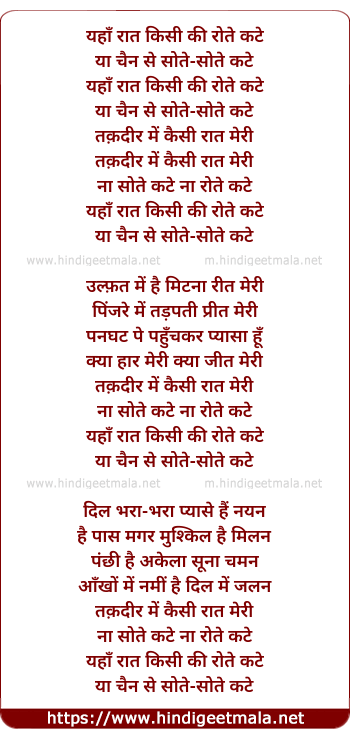 Lyrics of Yahaan Raat Kisi Ki Rote Kate Ya Chain Se Sote - यहाँ रात किसी की रोते कटे