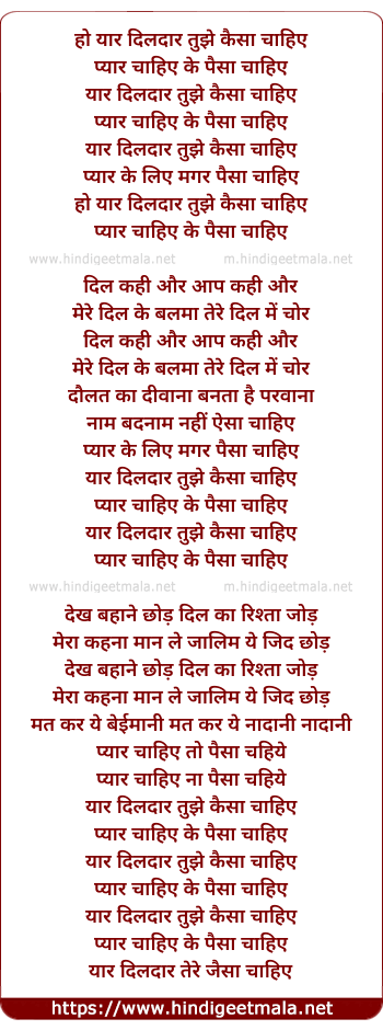Lyrics of Yar Dildar Tujhe Kaisa Chahiye - यार दिलदार तुझे कैसा चाहिए