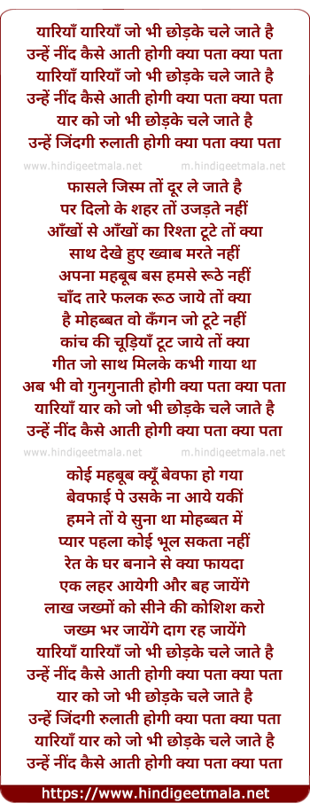 Lyrics of Yariyaan Yariyaan Jo Bhi Chhodake Chale Jaate Hain - यारियाँ यारियाँ जो भी छोड़के चले जाते है