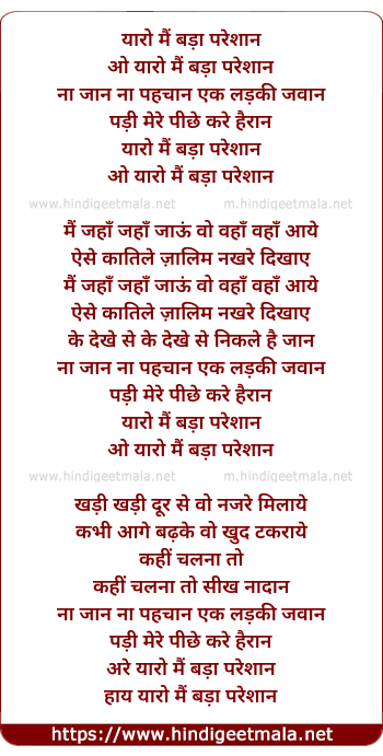 Lyrics of Yaro Mai Bada Pareshan - यारो मैं बड़ा परेशान