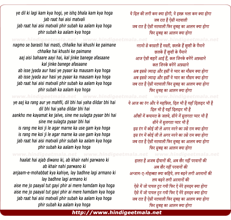 Lyrics of Ye Dil Ki Lagi Kam Kya Hogi - ये दिल की लगी कम क्या होगी