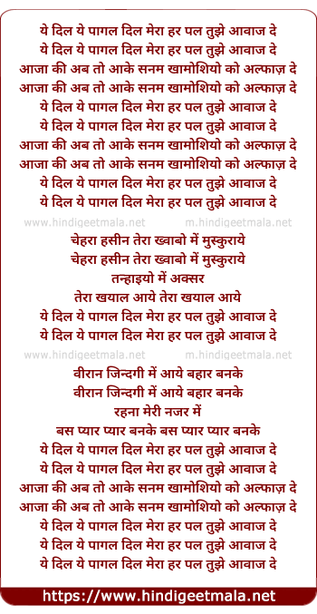 Lyrics of Ye Dil Ye Pagal Dil Mera - ये दिल ये पागल दिल मेरा