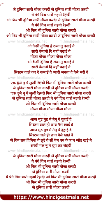 Lyrics of Ye Duniya Sari Mauja Kardi - जे दुनिया सारी मौजा करदी जे दुनिया सारी मौजा करदी