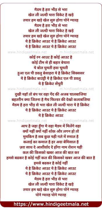 Lyrics of Madan Hai Hara Bhid Se Bhara, Ye Hai Cricket - मैदान है हरा भीड़ से भरा, ये है क्रिकेट