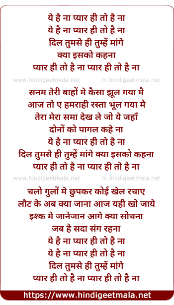 Lyrics of Ye Haina Pyar Hi To Haina - ये है ना प्यार ही तो है ना
