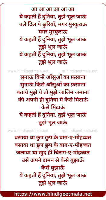 Lyrics of Ye Kehti Hai Dunia Tujhe Bhul Jau - ये कहती हैं दुनिया तुझे भूल जाऊँ