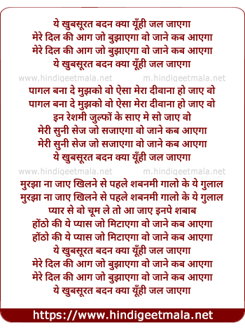 Lyrics of Ye Khubsurat Badan Kya Yuhi Jal Jayega - ये खुबसूरत बदन क्या यूँही जल जाएगा