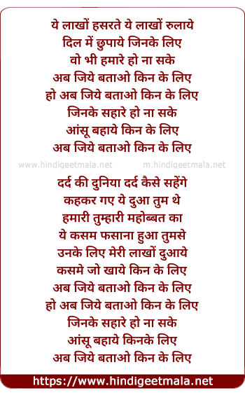 Lyrics of Ye Lakho Hasrate Ab Jiye Batao Kiske Liye - ये लाखों हसरते ये लाखों रुलाये