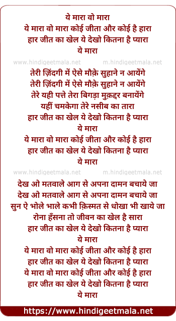 Lyrics of Ye Mara Wo Mara Koi Jeeta Aur Koi Haara - ये मारा वो मारा कोई जीता और कोई है हारा