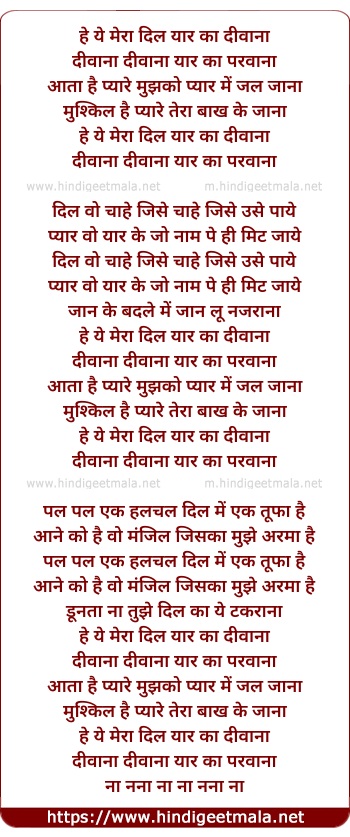 Lyrics of Ye Mera Dil Yar Ka Diwana - ये मेरा दिल यार का दीवाना